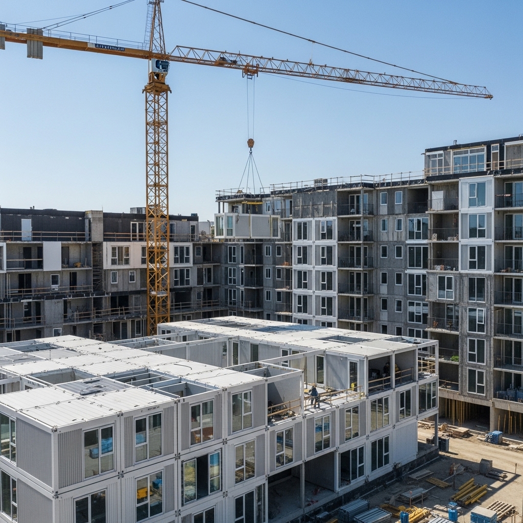 - A dynamic image showing modular units being lifted by a crane and assembled on a construction site, with partially completed buildings showcasing the seamless integration of these units. The image should convey speed and precision.