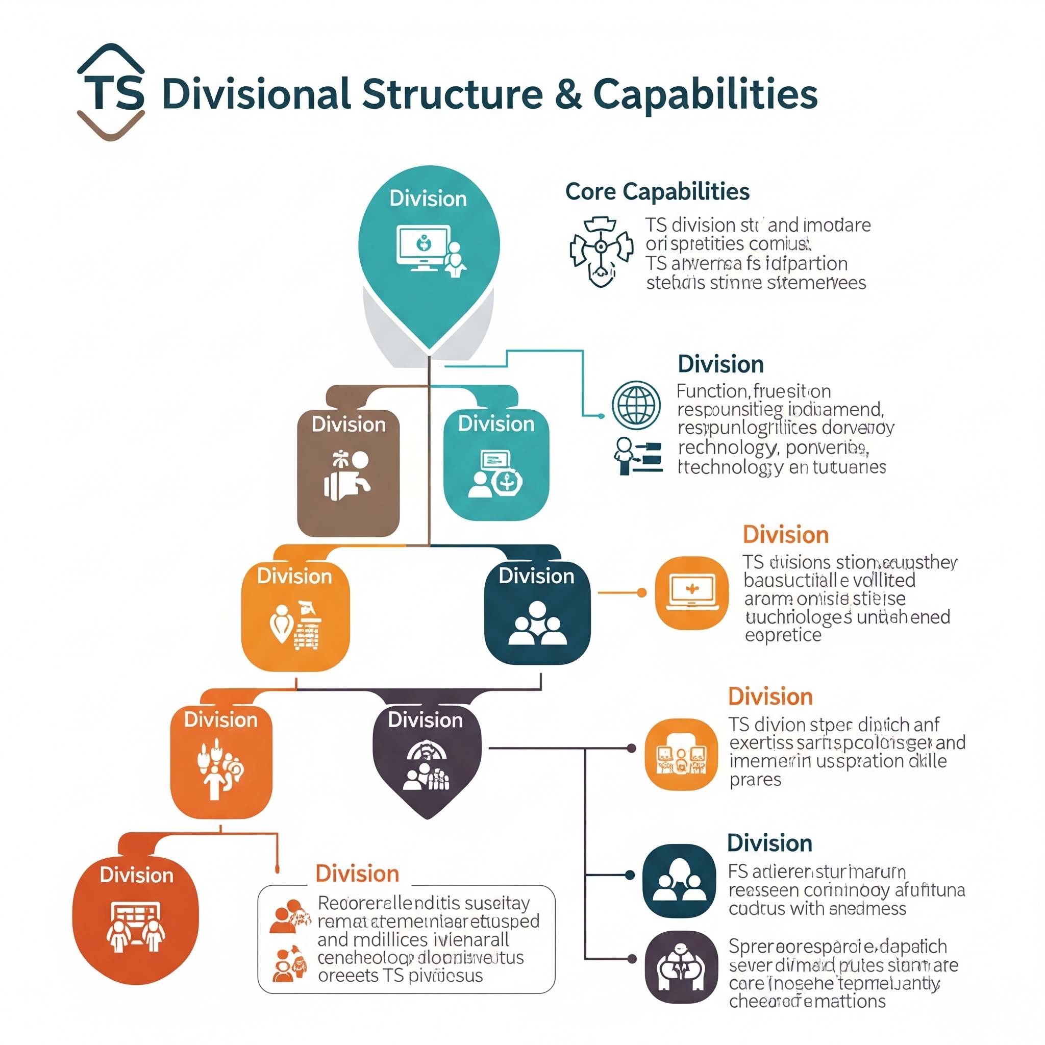 تعمل شركة Techno Solutions من خلال هيكل تقسيمي مركّز يضمن الوضوح والمساءلة والشفافية التخصص عبر مجالات الخدمة الأساسية. يتم دعم كل قسم من خلال الهندسة المشتركة وتخطيط المشاريع، والفرق التنظيمية التي تضمن التنفيذ السلس بدءًا من التخطيط وحتى التسليم.